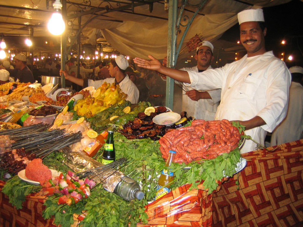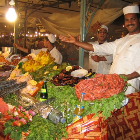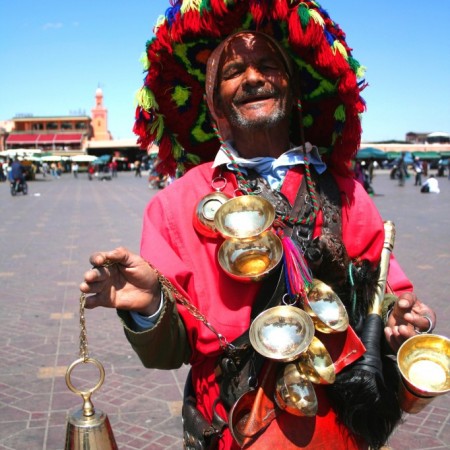 Volvemos a la plaza de Yamaa El Fna para contemplar su matutino espectáculo . Con el sol lucen los atiborrados y coloridos trajes de los aguadores que viven de las fotos previo pago de los turistas, las adormiladas cobras al ritmo de irritantes dulzainas árabes, tatuadoras de henna, expertas en cartomancia… Eso es Marrakech. Un teatro al aire libre en el que es imposible aburrirte. En la plaza tienes una gran oferta de restaurantes, como el Chez Chegrouni, donde probar el cuscús.