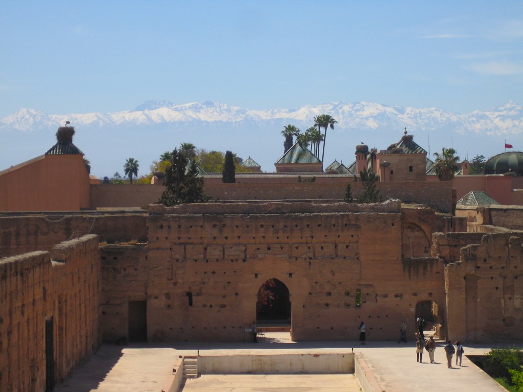 Seguimos. A 10 minutos caminando desde la plaza de Yamaa El Fna llegamos al Palacio de Badi (Ksibet Nhas). Una fortaleza medieval con murallas repletas de nidos de cigüeñas. Viendo las ruinas de este palacio nos podemos hacer una idea de cómo pudo ser en su esplendor. Dicen que llegó a tener más de 300 habitaciones decoradas con los mejores y más exclusivos materiales de la época. Lo más curioso es estar en manga corta mientras ves el Atlas nevado en el horizonte.