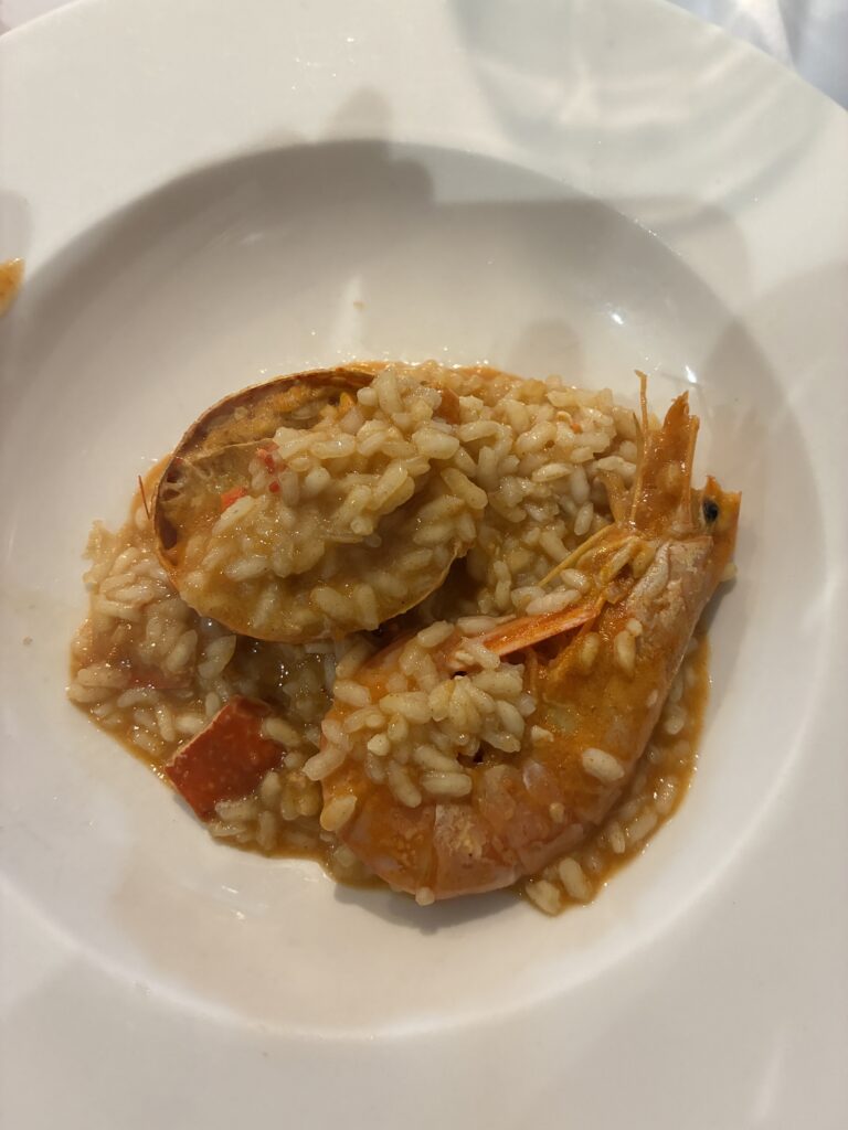 De entre todas sus propuestas, hay un plato que destaca por encima del resto y que, por sí solo, justificaría cualquier desvío en ruta: el arroz caldoso de bogavante. Preparado con mimo, fuego lento y producto impecable, este arroz es un homenaje a la cocina marinera clásica. El bogavante llega jugoso, fresco, de carne firme, y el caldo —oscuro, intenso y profundamente aromático— resume el alma del mar en cada cucharada. No es raro escuchar en el comedor que muchos viajeros han llegado hasta Rinlo únicamente para probarlo… y que siempre repiten.