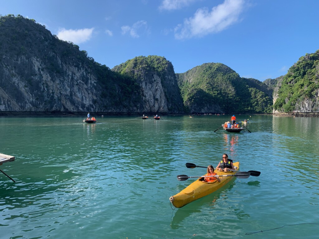 4- Recorrer en crucero (2 días) la bahía de Halong. La limpieza de la bahía deja un poco que desear. Aún así vale la pena. Y dentro de las actividades que ofrecen desde el barco, la de recorrer en kayak la bahía, es un imprescindible en Vietnam.