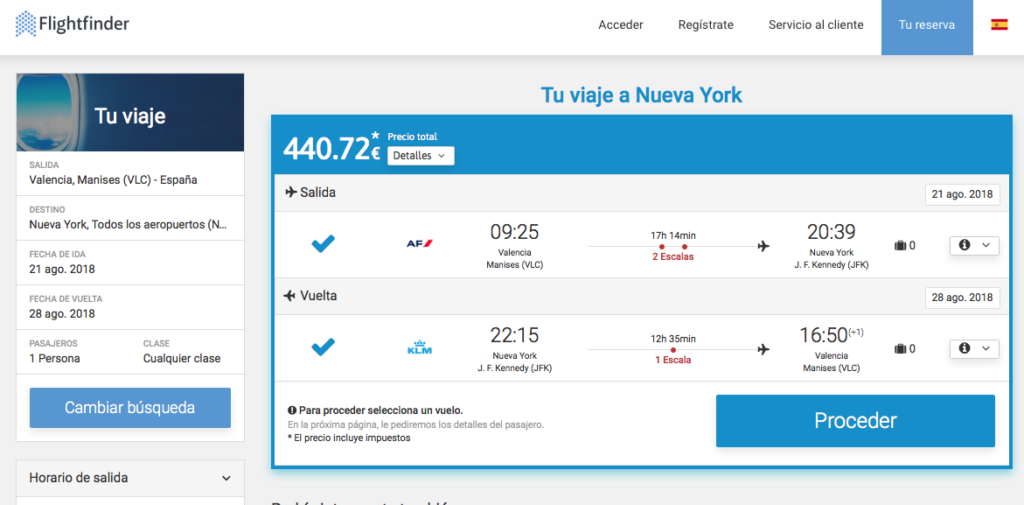 - flightfinder.es/Results?action=search&onlyDirectFlight=false&depLoc0=VLC&depDate0=201808210000&arrLoc0=NYC&depLoc1=NYC&depDate1=201808280000&arrLoc1=VLC&adults=1&children=0&infant=0&lang=¤cy=&cabinClass=&profileId=52183045-19b6-4a9b-898c-7cb1e56f068d&solutionKey=VLCNYC474%2c93KL2658VLC21080925AMS210811550KL1019AMS21081440LHR210815000AF3666LHR21081730JFK210820390KL644JFK28082215AMS290811351KL1503AMS29081425VLC290816501%2cP0&utm_source=kayak_ffes&utm_medium=ppc&utm_campaign=affiliate+meta&kayakclickid=tFrCvKtGGqQjQzmYNTM88g&tduid=5cece5db66986d9f7627c5d90b89392c#results